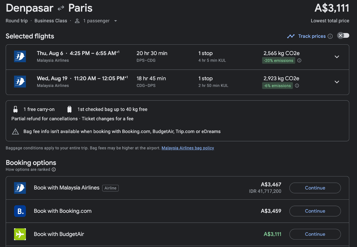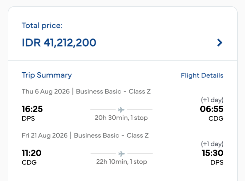 Here are the full details of this great Business Class airfare from Bali to Paris…