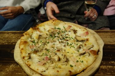 So we back tracked and went into a shopping street as usually a few restaurants. Well there were but most had between 2 and 10 seats so we weren't going to fit. We passed a pizza place which I pointed out and the grandkids thought it looked good but again overruled. After about 15 minutes the pizza restaurant became the only real choice. So in we went. There was an English menu but the server didn't speak any English so pointing was the way to order. Thre wasn't that much English on t he English menu