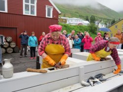 We did a tour of the island with Siri, the daughter of the current occupying generation of her family. Since the little Terns were nesting and quite protective of their nests we had to stick to a marked path and carry flags on sticks for them to attack, instead of our heads! Siri also went through the process they use to collect, clean and dry the Eiderdown. The down is collected by hand after the chicks have left the nest and it is processed in part by machinery but finally by hand to remove the final sticks and other contaminants. Vigur sells about 60kg of down each season and we now know why it is so expensive. After the tour we were served a delicious morning tea with homemade cakes.