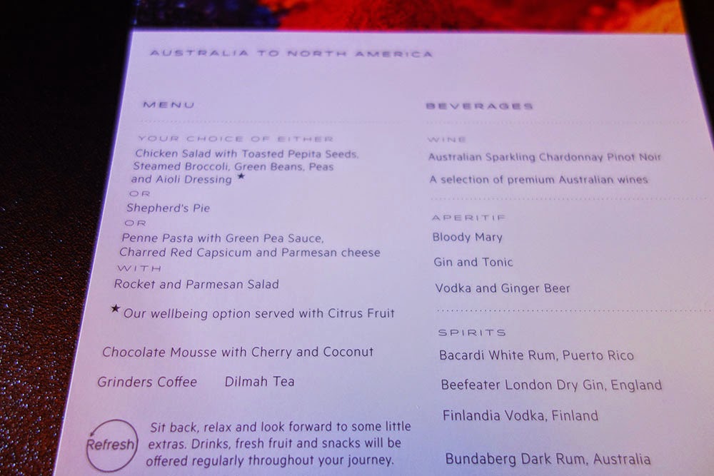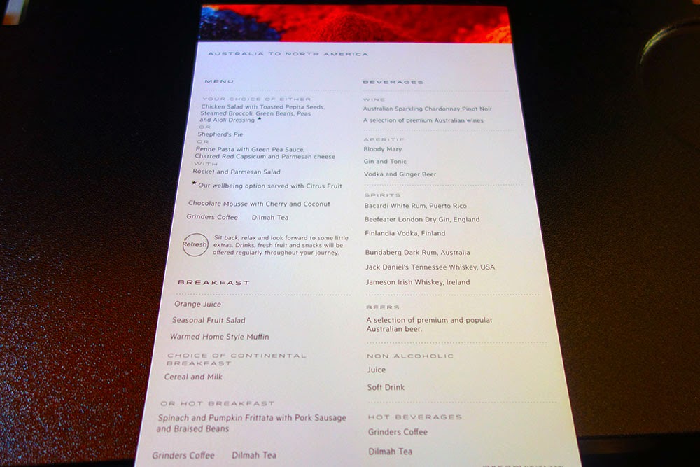 We finally gained cruising altitude as the seatbelt sign was extinguished to which the cabin crew sprung to life by handing out a menus and bottles of water and headphones to each passenger. I could smell the aroma of lunch wafting around the cabin as I checked out the menu and noticed the wellbeing option which caught my attention as I sat and decided what I wanted for lunch. An announcement came over stating that federal laws prohibit passengers to congregate in large groups around the lavatories which was a bit humorous but at the same time in place just in case.