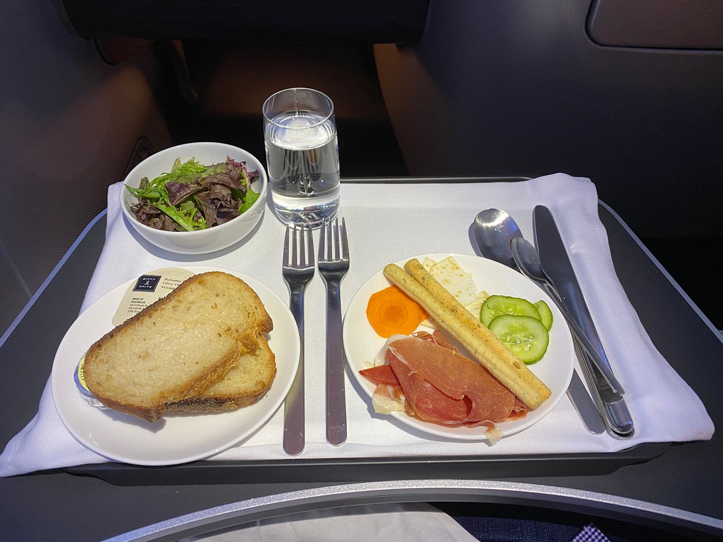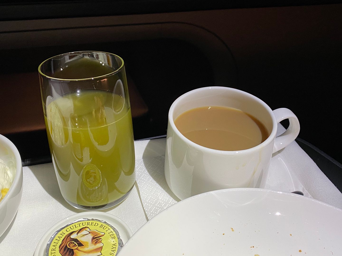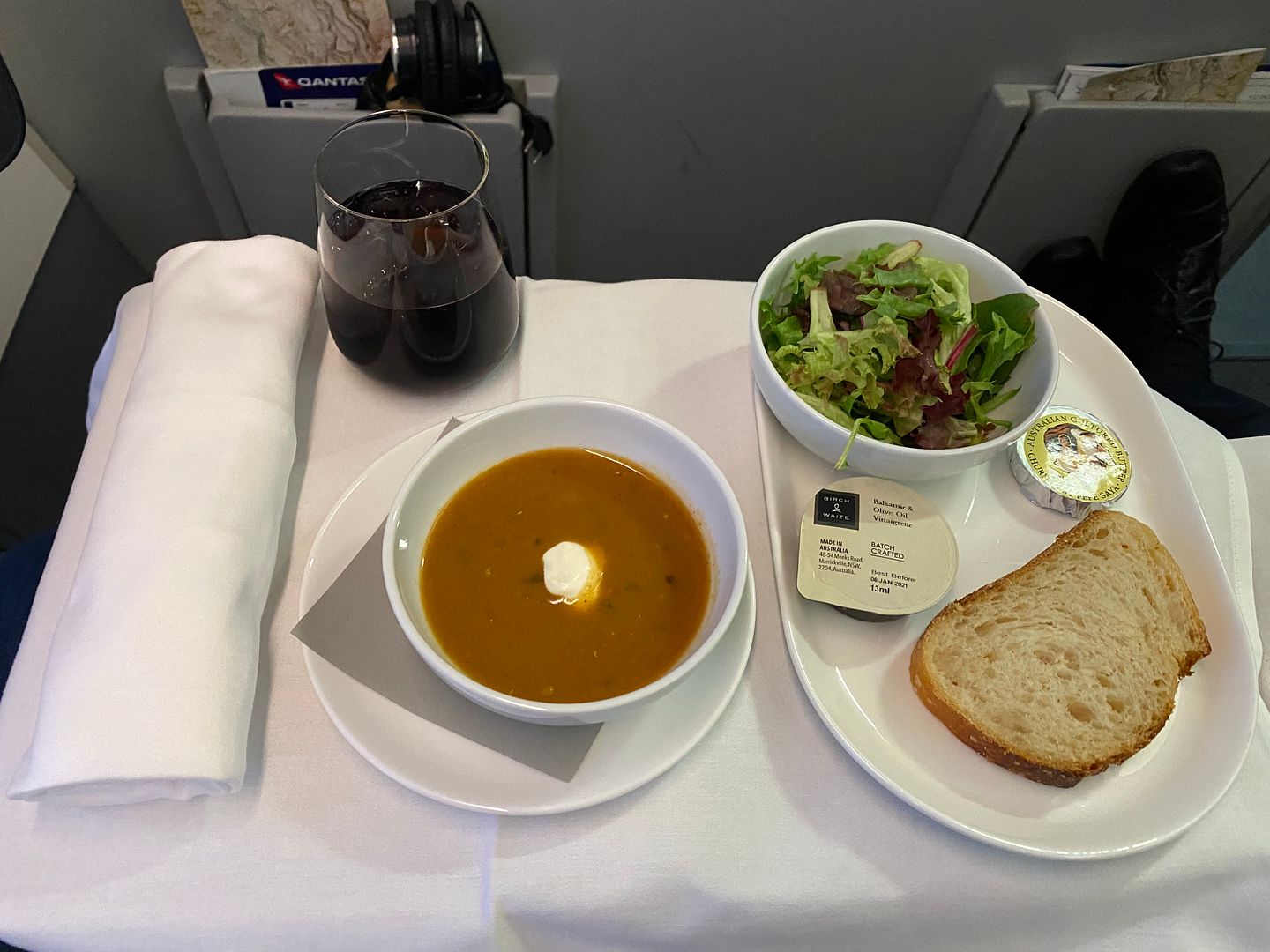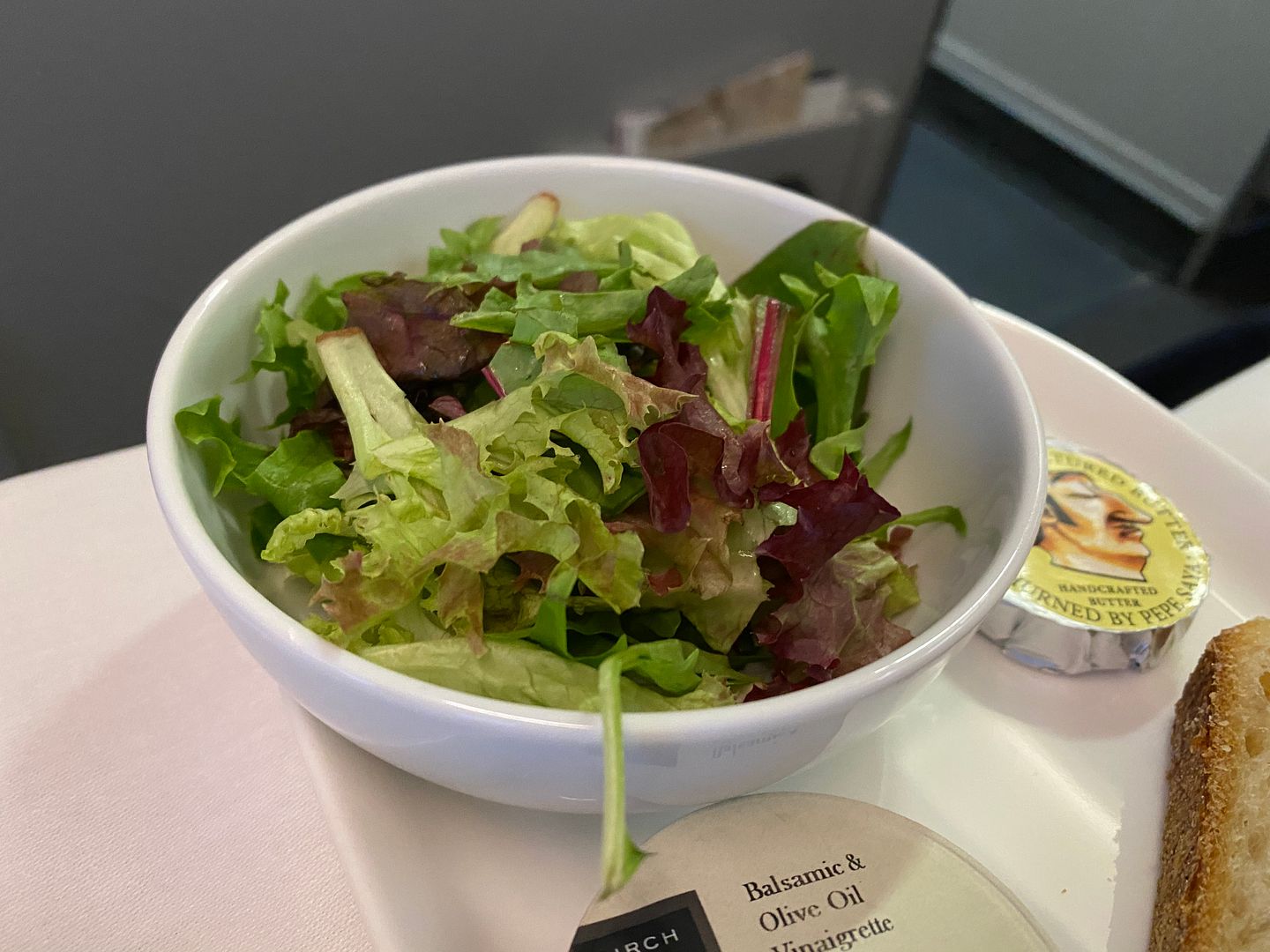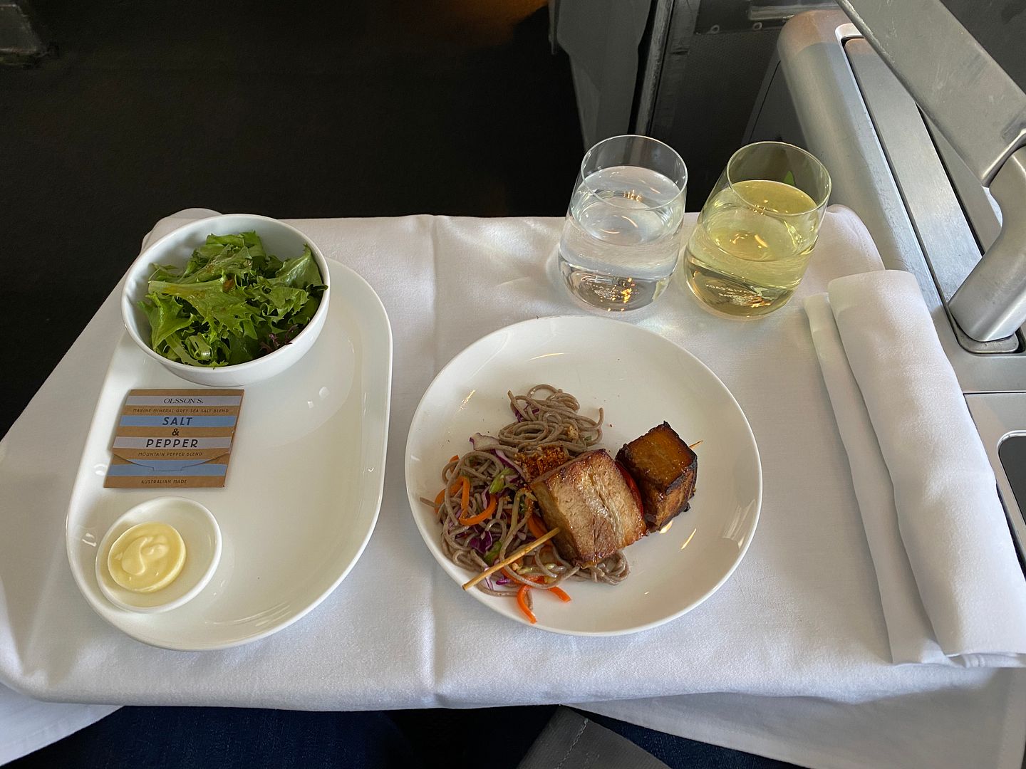 Mid flight I had the Japanese meatballs, twice. The lime mayo I thought was bland, but the meatballs, accompanying cabbage greenery and sauce were lovely.