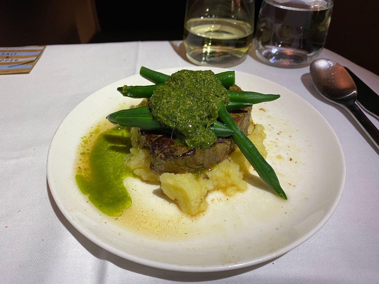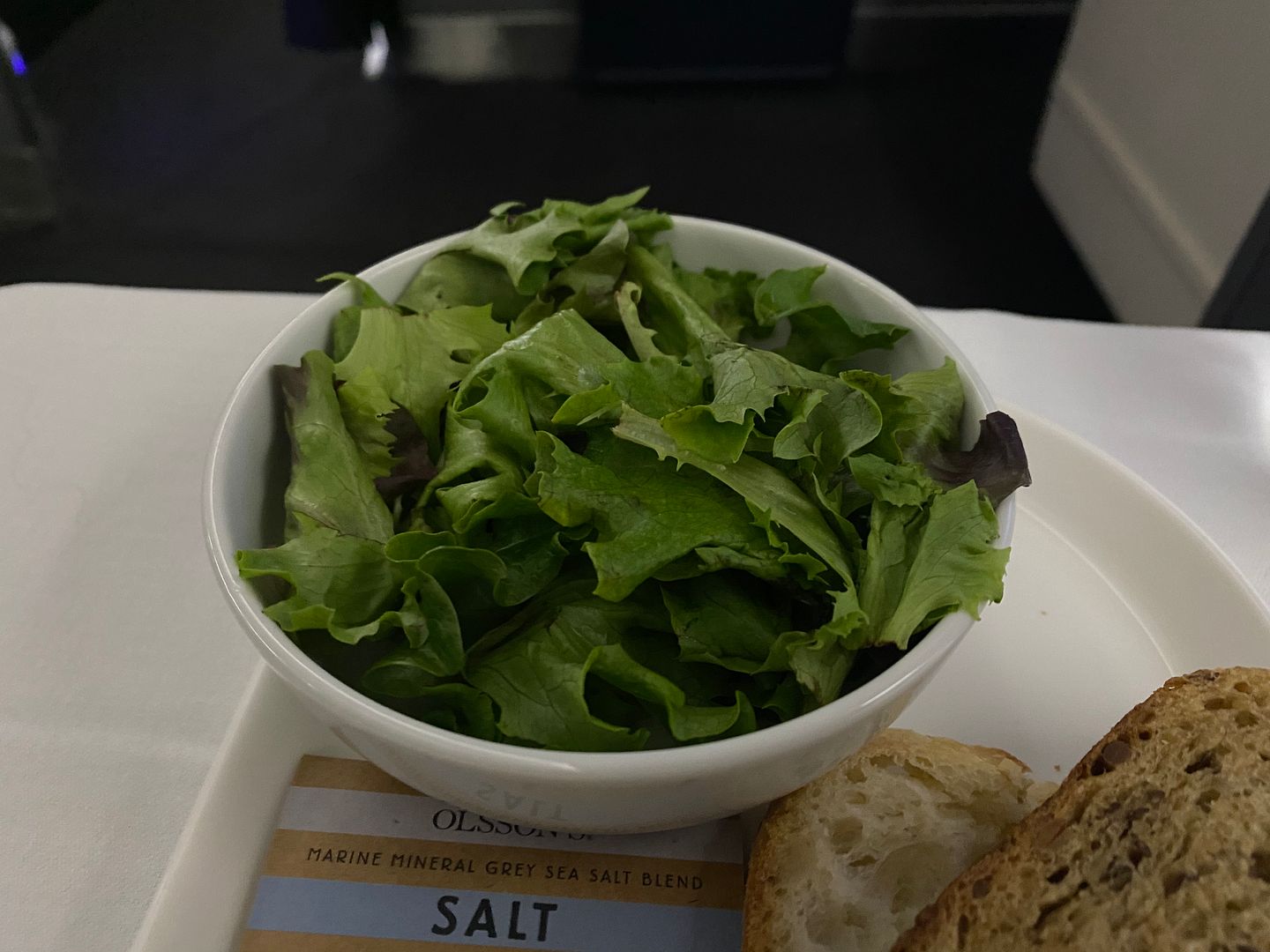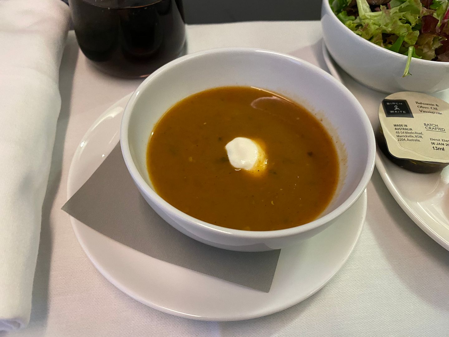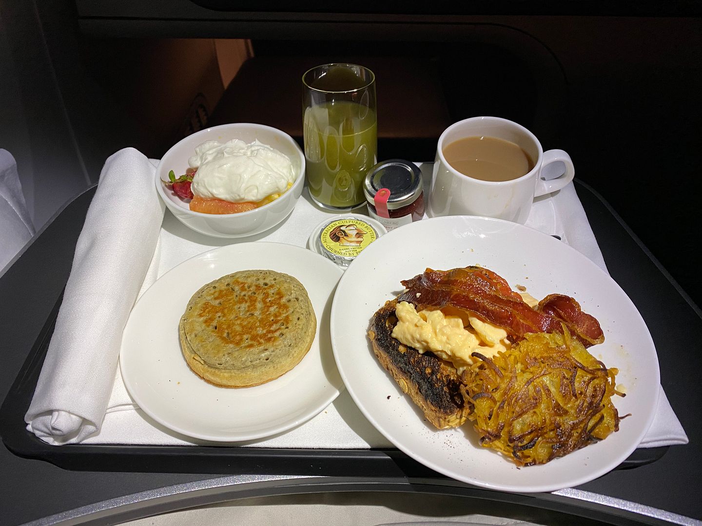 Mid flight I had the Japanese meatballs, twice. The lime mayo I thought was bland, but the meatballs, accompanying cabbage greenery and sauce were lovely.