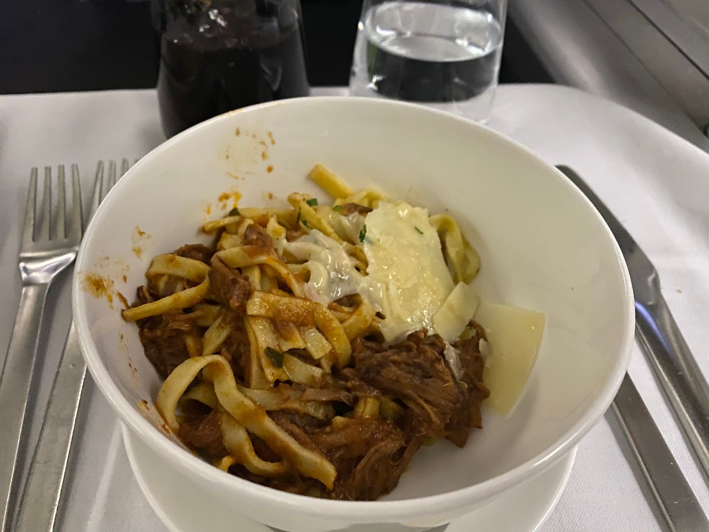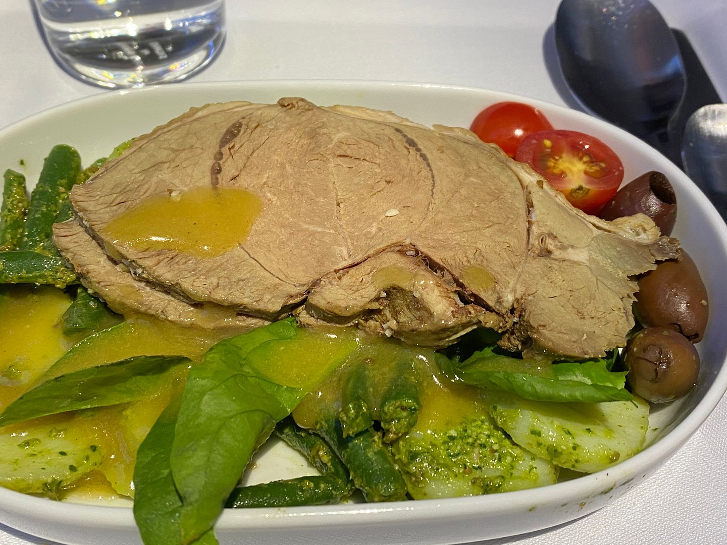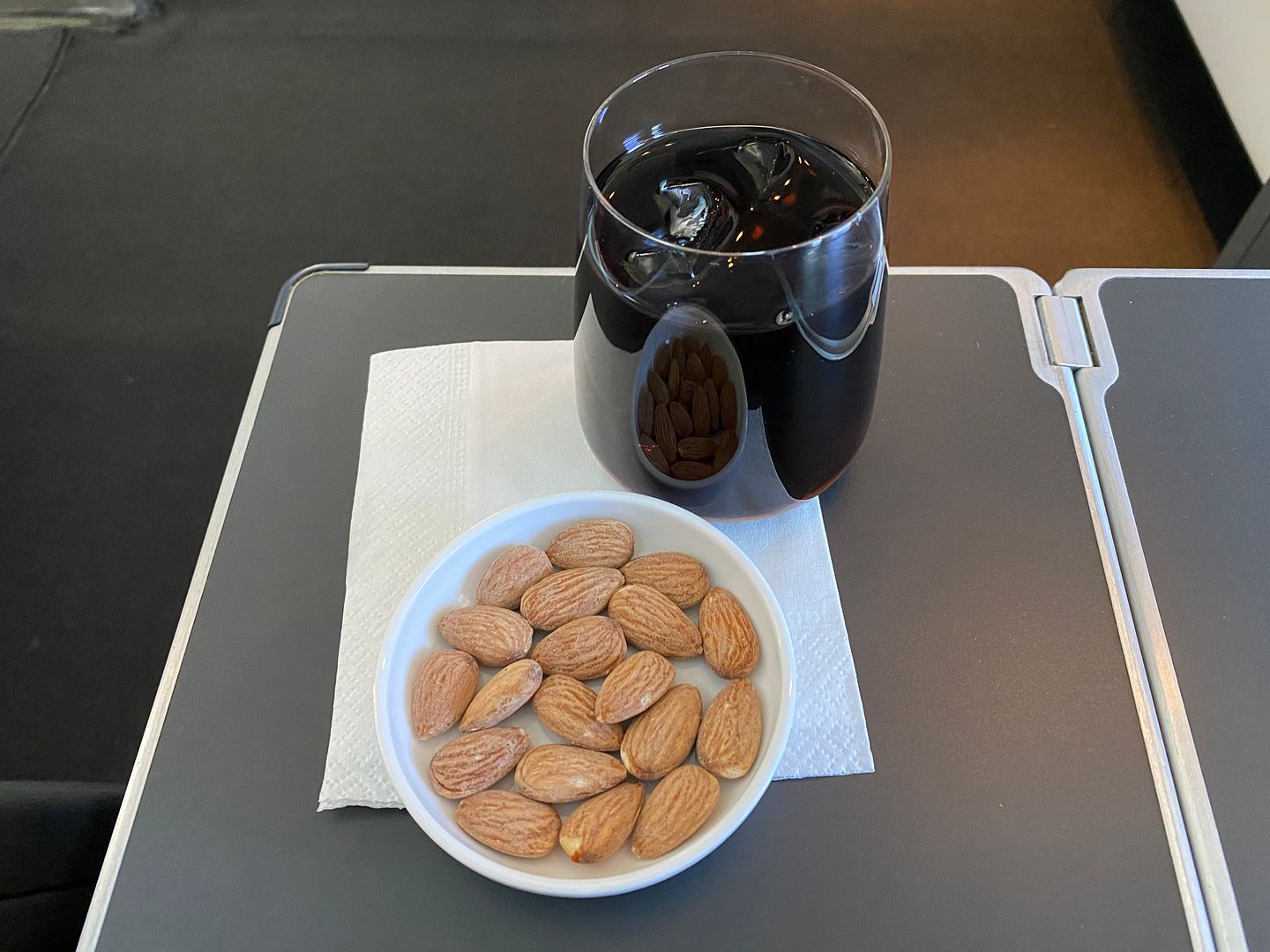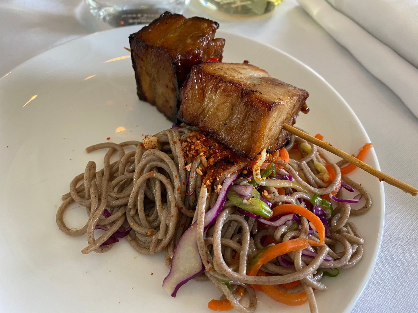 Mid flight I had the Japanese meatballs, twice. The lime mayo I thought was bland, but the meatballs, accompanying cabbage greenery and sauce were lovely.
