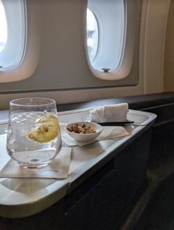 Boarding was quick and I was shown to my seat and offered a predeparture drink - although champagne was offered I opted for sparkling water.