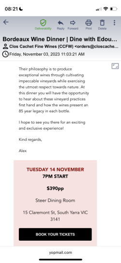 - Thursday 22nd June: Levantine Hill Wine Dinner - $128.69