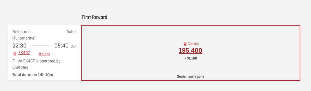 If available, a one-way First Classic Reward from Melbourne to Dubai flying Emirates costs 195,400 Qantas points + $1,166 in taxes & carrier charges. (The points portion of this redemption will increase to 234,500 Qantas points from 31st March 2026.)