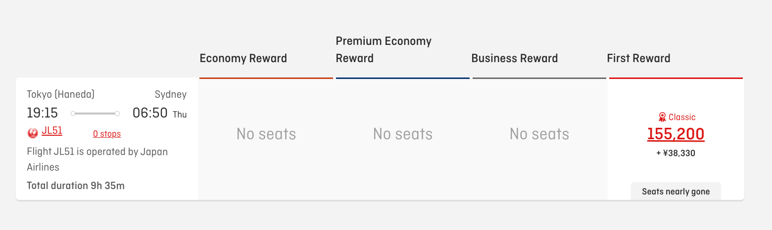 Japan Airlines flies its Boeing 777-300ER aircraft on its daily Sydney-Tokyo (Haneda) service seasonally, usually during the Northern Winter period. This aircraft type has 8 First Class seats at the front, which you can book using Qantas points. It costs 155,200 Qantas points plus approximately AUD350 for a Japan Airlines First Class redemption.