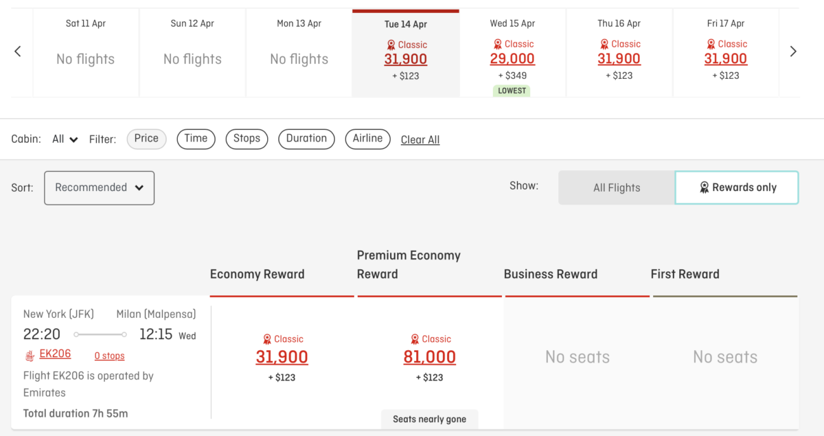 In the New York to Milan example above, Emirates was offering the only non-stop flight available for points redemption. Premium Economy costs 81,000 Qantas points plus USD123. Business Class wasn’t available on this particular flight. Instead I could opt for British Airways on the same date for 90,000 points and USD1,426 (!!) in taxes and carrier charges. This would also involve a transfer at Heathrow with the onward connection to Milan in “Euro Business” on a narrow-body aircraft. If my dates were fixed and this was my only choice, the Emirates value proposition would be compelling enough to consider.