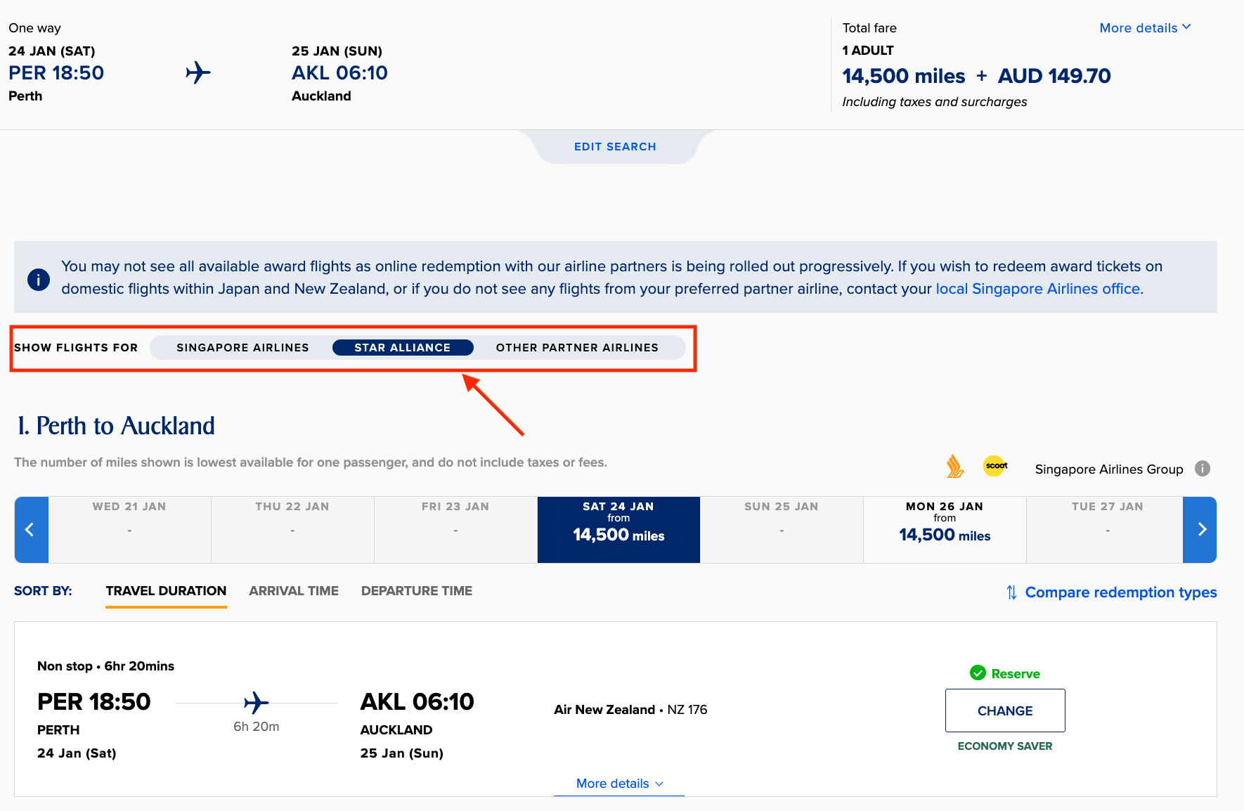 To book a Star Alliance award flight on the Singapore Airlines website, you need to select “Show flights for Star Alliance” on the booking page (as shown above). Otherwise, when you view flight redemption options, the Singapore Airlines website, by default, will show only Singapore Airlines flights.