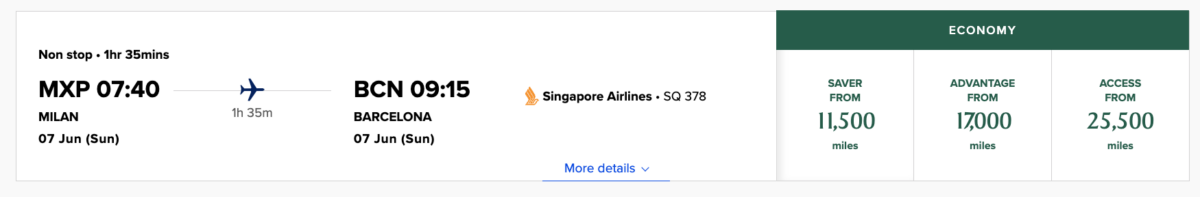 Singapore Airlines operates a fifth freedom flight (SQ378) within Europe from Milan (MXP) to Barcelona (BCN). It would cost 11,500 KrisFlyer miles plus taxes one-way in Economy Class for this route.
