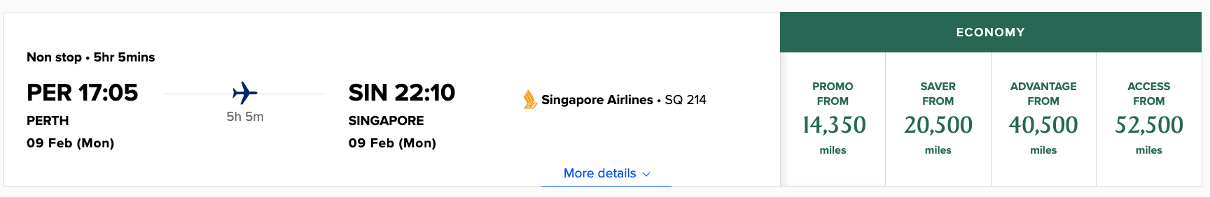 - Any route from Australia (excl. Perth) to Singapore (12,500 KrisFlyer miles + taxes)